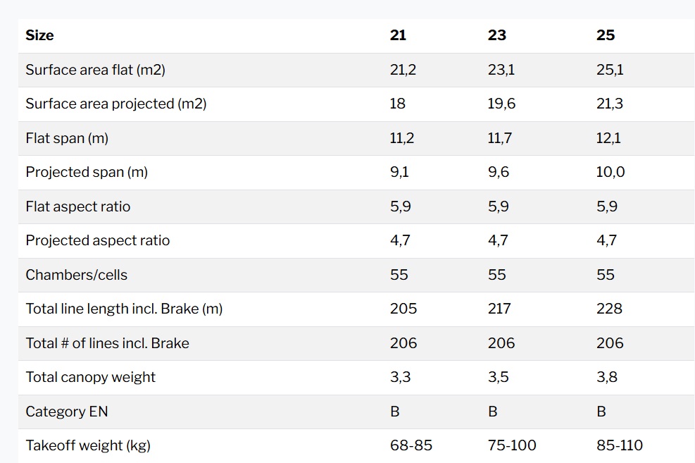 Üç seri boyutu (21, 23, 25) birlikte 68 ila 110 kilo arasında geniş bir ağırlık aralığını kapsar. Sık sık çok fazla bagajla kamp uçuşlarına çıkıyorsanız, kalkış ağırlığı açısından bunu dikkate almalısınız. Genel olarak, KANGRI X’in en iyi performansı üst ağırlık aralığında bulunur. Bu bağlamda bilmeniz gerekenler: İpler, SUMMIT X (EN/LTF B) ve TRANGO X (EN/LTF C) ile aynı şekilde üretilmiştir. Bu, hızlandırılmış uçuş için optimize edildikleri ve KANGRI X’in üç seri boyutunun her biriyle ayrı ayrı ayarlandıkları anlamına gelir. Boyut konusunda emin değil misiniz? “Doğru yamaç paraşütü boyutunu nasıl bulursunuz ?” başlıklı SSS bölümümüz karar vermenize yardımcı olabilir.